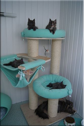 Da wir es lieben wenn alles hübsch und farblich abgestimmt ist, haben wir für unsere Minis ein kleines " türkisfarbenes " Reich geschaffen ;-) Passend zum Teppichboden wurde der Kratzbaum neu benäht und darauf geachtet, dass es natürlich auch genau zum schicken " pEi Pod " paßt ;-)