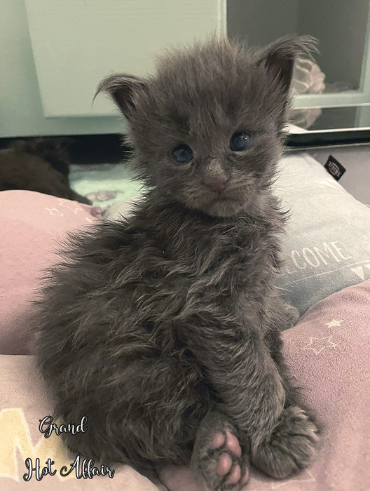 Um ihn zu behalten, brauchte es eigentlich keine große Überlegung, denn abgesehen von der Farbe BLUE bringt er noch viele beeindruckende Attribute mit, was an Hand seines Stammbaums, natürlich nicht verwunderlich ist. Unsere imposantesten und größten Katzen sind seine Vorfahren und wie es sich bereits schon jetzt andeutet, wird er eine fantastische Größe erreichen ! Sein rassetypischer Wildook und die breite massige Schnauze, ist unübersehbar Mamas Werk, das sehr üppige Fell und den hinreißenden Charme - einer der größten Kampfschmuser - ist eindeutig das Erbe seines riesigen Vaters ! Mit großer Freude beobachten wir seine weitere Entwicklung und können es kaum erwarten, seine ersten Kinder hier rumhüpfen zu sehen ;-)