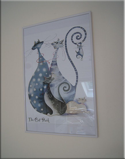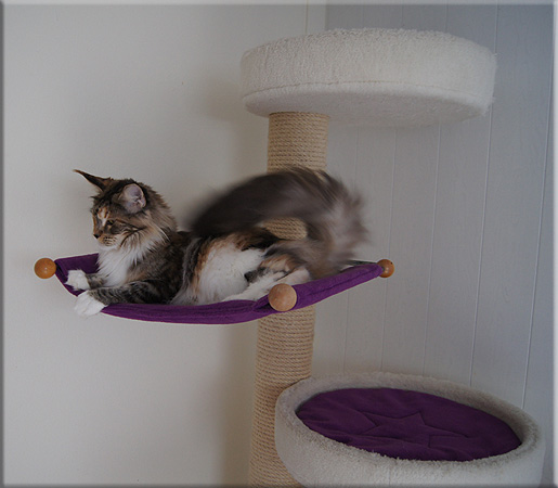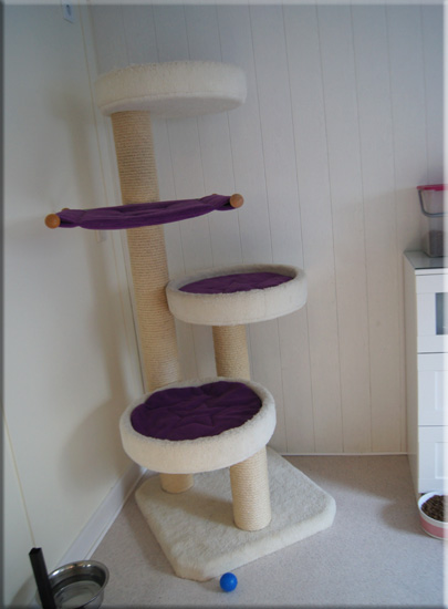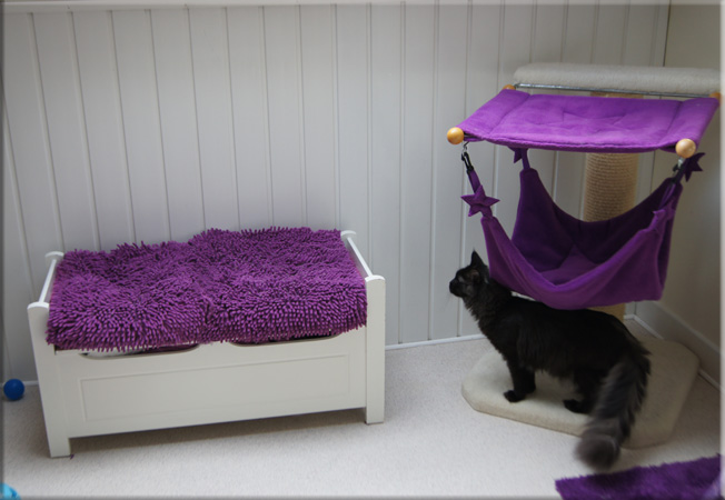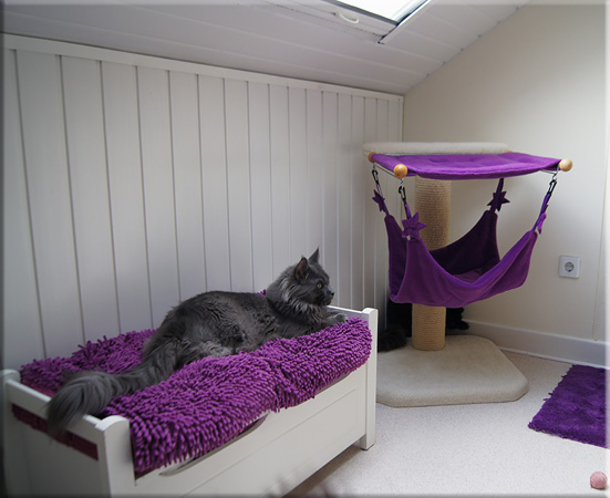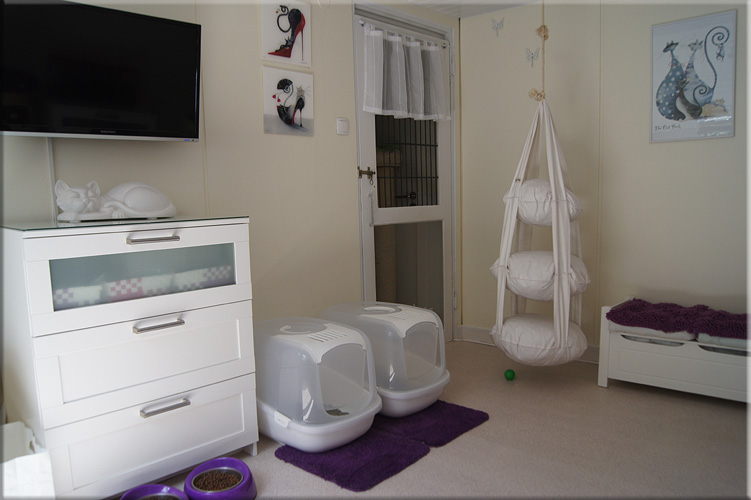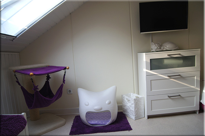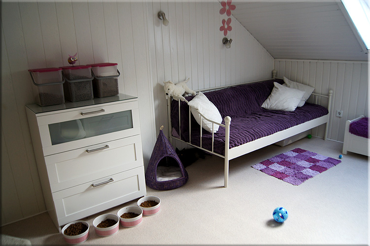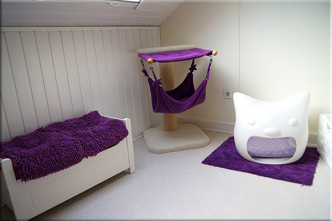 Das ist das hintere Zimmer unserer Kitten-Suite, das ebenfalls modernisiert und erneuert wurde. Alles erstrahlt wieder mit frischen Farben, weißen Möbel und hübschen Bildern im neuen Glanz ! Die älteren Kratzbäume bekamen durch neue Bezüge und Einlagen - alles farblich abgestimmt - wieder " PEPP " ;-) Das Fenster wurde durch einen besonderen Schutz gesichert, sodass selbst bei kompletter Öffnung niemand "ausbüxen" kann :-) Ich kann bei anstehenden Geburten bequem übernachten und sollten die Nächte einmal sehr lang werden, ist auch für Unterhaltung gesorgt :-)